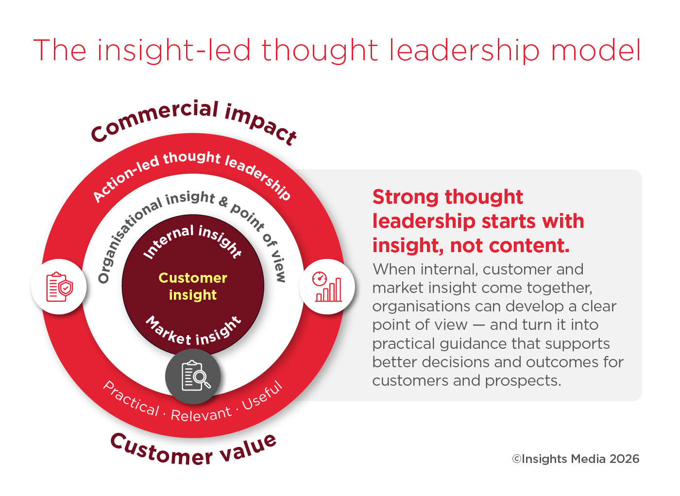 One of the many outputs of our insight work is thought leadership. Generating insights to provide a compelling point of view that’s backed by evidence that you can share in the market and with customers too. This is the type of content that helps you showcase your thinking and demonstrate how you help customers overcome their challenges. The graphic encapsulates the approach – insight – point of view – action-oriented content.